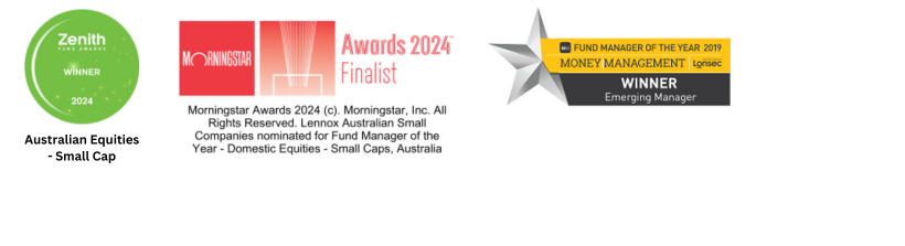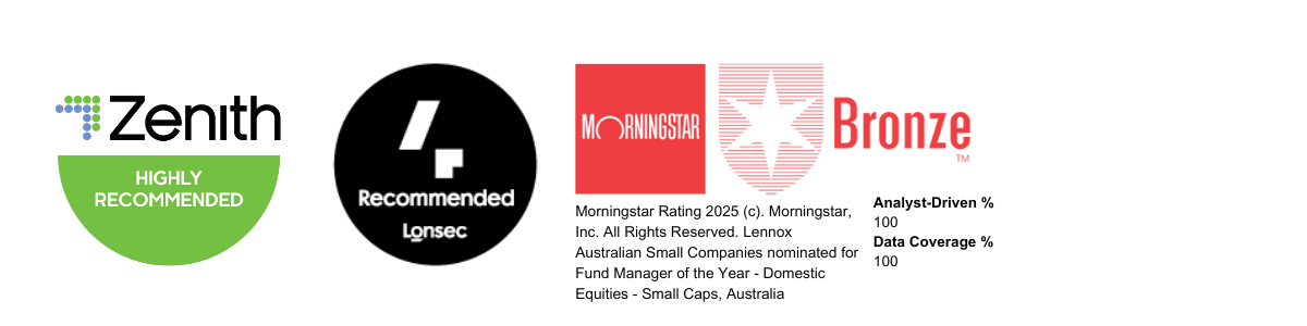 The Lennox Australian Small Companies Fund received a Morningstar Medalist Rating™ of Bronze on 28-08-2025. © 2025 Morningstar, Inc. All rights reserved. The information contained herein: (1) is proprietary to Morningstar and/or its affiliates or content providers; (2) may not be copied, adapted or distributed; (3) is not warranted to be accurate, complete or timely and 4) has been prepared for clients of Morningstar Australasia Pty Ltd (ABN: 95 090 665 544, AFSL: 240892), subsidiary of Morningstar. Neither Morningstar nor its content providers are responsible for any damages arising from the use and distribution of this information. Past performance is no guarantee of future results. Any general advice has been provided without reference to your financial objectives, situation or needs. For more information refer to our Financial Services Guide at www.morningstar.com.au/s/fsg.pdf. You should consider the advice in light of these matters and if applicable, the relevant Product Disclosure Statement before making any decision to invest. Morningstar’s publications, ratings and products should be viewed as an additional investment resource, not as your sole source of information. Morningstar’s full research reports are the source of any Morningstar Ratings and are available from Morningstar or your adviser. To obtain advice tailored to your situation, contact a financial adviser. Some material is copyright and published under license from ASX Operations Pty Ltd ACN 004 523 782.