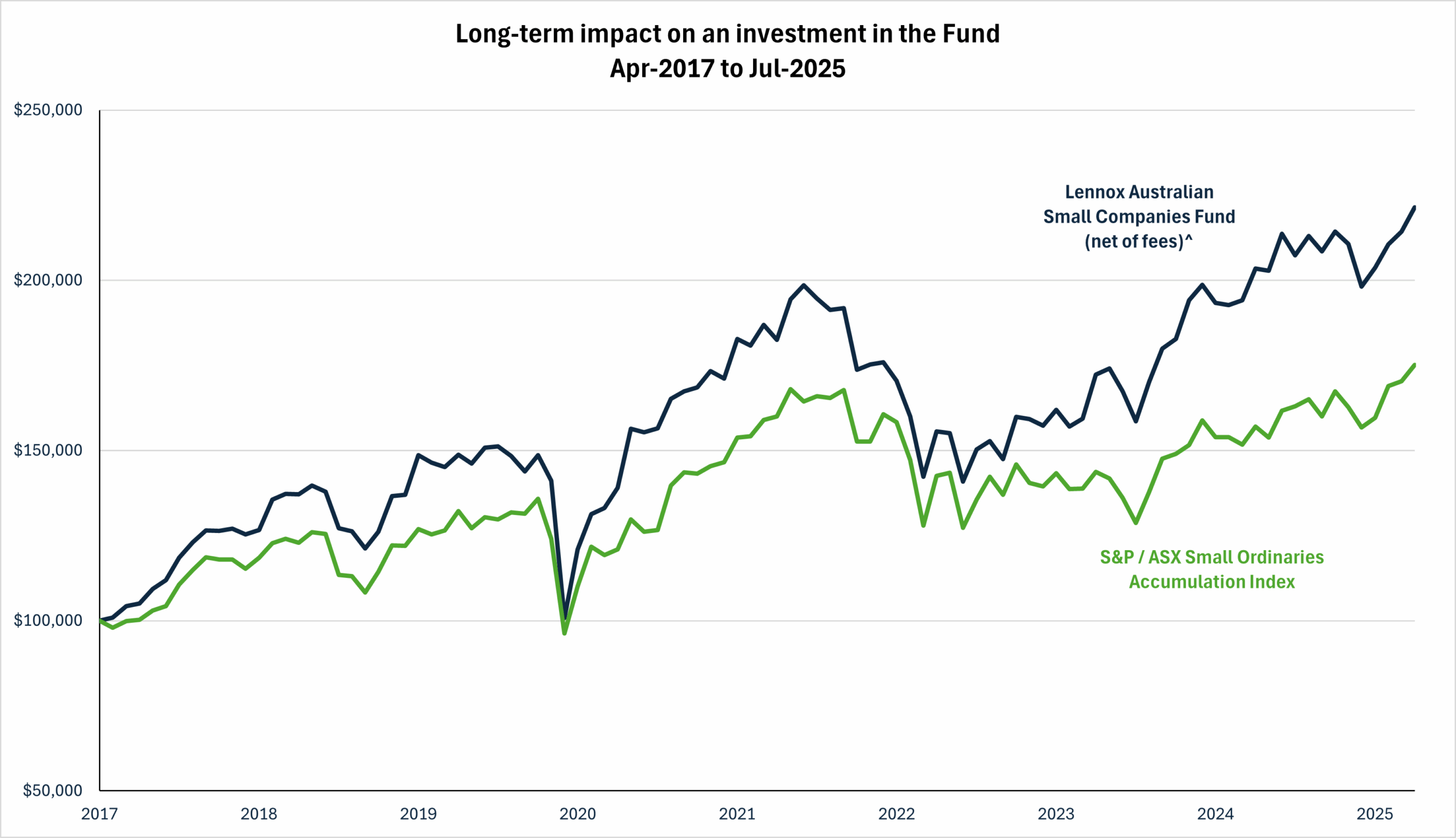 ^Past performance is not a reliable indicator of future performance. As at 31 July 2025. Returns are calculated after fees have been deducted and assume distributions and been reinvested. No allowance is made for tax when calculating these figures. The inception date for the Fund is 28 April 2017. The benchmark for the Fund is the S&P/ASX Small Ordinaries Accumulation Index.