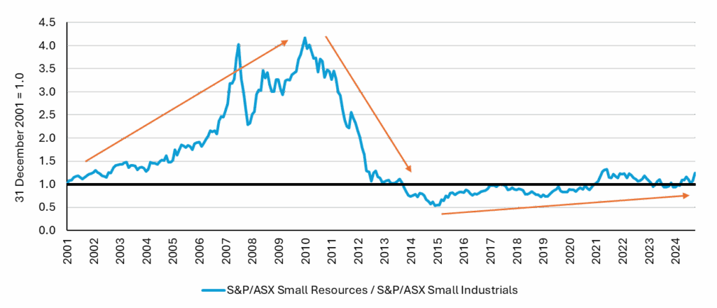 Chart 1: Relative performance of the S&P/ASX Small Resources Index, versus the S&P/ASX Small Industrials Index, from inception in December 2001 to September 2025
