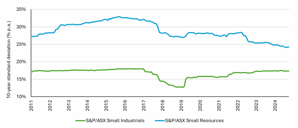 Chart 2: Monthly-rolling 10-year standard deviation of the S&P/ASX Small Resources Index and S&P/ASX Small Industrials Index, December 2011 to September 2025