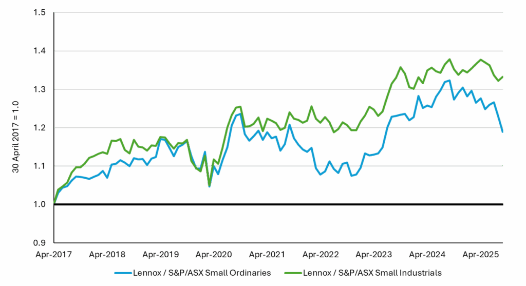 Chart 4: Cumulative outperformance of the Fund versus S&P/ASX Small Ordinaries Index and S&P/ASX Small Industrials Index since inception, April 2017 to September 2025